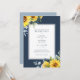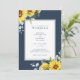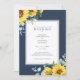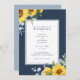 Um convite elegante, de girassol e design de folhagem de eucalipto, com tema de cor azul marinho e poeirento. Pronto para personalizar com fontes de sua escolha ou sair conforme mostrado aqui e adicionar seus detalhes para seu dia especial.
