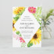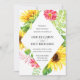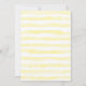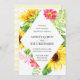 O convite para o casamento de girassol em amarelo e pistas de flores cor-de-rosa e folhas verdes. O quadro floral está em forma de diamante com os detalhes do convite na dentro. O verso do convite é decorado com listras de aquarela amarelas claras. O plano de fundo da placa é branco, mas você pode selecionar uma matiz no seletor de cores.
