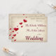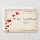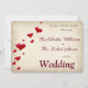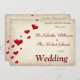Vários corações vermelhos bonitos estão voando contra um fundo bege claro no lado esquerdo deste convite romântico de casamento... esta design é perfeita para um casamento Dia de os namorados!