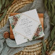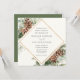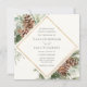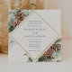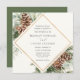 O convite para o casamento no Elegante Winter apresenta um quadro de ouro rodeado por cor d'água verde, pinheiros e flores de inverno. Personalize com suas informações ou clique em "Clique para personalizar mais" para editar estilos de fonte, tamanho e cores.