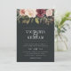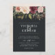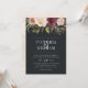 Convites florais para casamentos, outono ou casamentos no inverno de chic apresentam seus detalhes em letras brancas em um fundo preto rico. Um spray de rosas, mães e verde de aquarelas grava o topo, em cores rústicas do outono, incluindo pêssego, marfim, blush, burgundy e verde. Um design moderno e elegante para casamentos quentes rústicos nos meses de outono ou inverno.