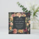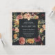 Nosso convite para o casamento do Jardim da Lua em um formato quadrado único enquadra seus detalhes de casamento com rosas e mães pintadas de aquarela em tons de burgundy, marsala, cor-de-rosa-pincel e pêssego, com folhagem verde-escura e folhas. Uma escolha elegante para o outono ou casamentos no inverno, com flores exuberantes em um fundo fora do preto dramático.