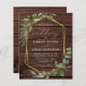 Este elegante convite de casamento rústico apresenta uma estrutura geométrica de folha falsa de ouro decorada com eucalipto e verde de azeitona em um fundo de madeira de celeiro. A palavra "casamento" aparece em escrita caligráfica. Personalize o texto branco com os nomes da noiva e do noivo e os detalhes do casamento na frente, e suas iniciais e URL do site no verso.