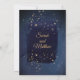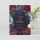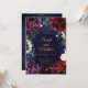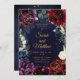 Um convite de casamento de marinho arrojado que apresenta uma cena pintada de cor d'água de peões burgundy e azuis marinho com sotaques de ouro a brilhar contra um fundo de cor d'água de marinho profundo.