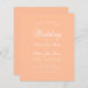 Um simples convite para casamento de orçamento minimalista. Tem apenas texto branco sobre fundo de pêssego (uma cor moderna). A palavra Casamento e os nomes são escritos em um roteiro caligráfico elegante.