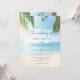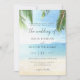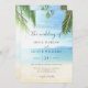 Palmeiras tropicais de aquarela e praia em conjunto com um roteiro elegante de caligrafia fazem com que este convite para o casamento na praia se sinta fresco e convidativo. Personalize com suas informações de casamento.
