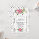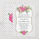 Na moda e convite romântico de casamento feito em fundo branco, com pequenas bolinhas pretas. Uma área de texto decorativo e decorativo dourado, no meio do convite, tem um belo trabalho de arte de aquarela de flores cor rosa. Personalize o texto preto para seu dia especial. Os produtos correspondentes estão disponíveis.