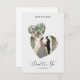 Convite para casamento de pequeno porte com um simples design, com toques roxos sutis.