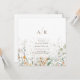 Petite Wildflower Wedding design mostrado em um convite quadrado, apresenta uma fronteira de flores silvestres delicadas e aquáticas ao longo do fundo e os monogramas felizes dos casais no topo. SAVE MONEY, PAPER and TIME with design: Há espaço no verso para incluir seu site de casamento para mais informações e para RSVP.