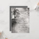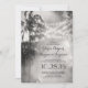 convite para casamento de praia em preto e branco com uma série de luzes penduradas nas palmeiras costeiras