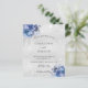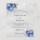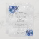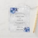Fundo metálico de aspecto fino prateado, decorado com flores azuis e poeira brilhante fraca. Personalize e adicione seus nomes e detalhes do casamento. Letras pretas coloridas.