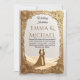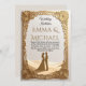 Um convite de casamento luxuoso que inclui um quadro floral de ouro ornamentado, fundo de marfim e uma elegante silhueta de noiva e noivo em ouro misturado. Perfeito para casais que buscam elegância de eterno e um estilo especial de papelaria de casamento.