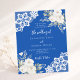 Para um casamento elegante e romântico. Um fundo de cor azul cobalto decorado com flores, rosas e rendas brancas. Personalize e adicione seus nomes e detalhes. 1 folha = 1 convite impresso de borda a borda.