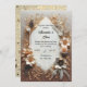 Um convite de casamento elegante, feito em arco, com ouro luxuoso de champanhe e flores brancas de pérolas com folhagem metálica. Um fundo de bronze em shimmering complementa o painel central branco com delicados detalhes de folha de ouro, criando uma combinação perfeita de sofisticação clássica e luxo moderno.