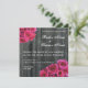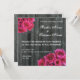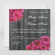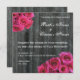 Um convite de casamento com uma foto de fundo de madeira de celeiro. Fotos de bouquets de rosa-quente nos cantos superior esquerdo e inferior direito. Personalize o texto correspondente com detalhes do evento. O verso apresenta fundo de madeira de barnwood. A redação é de noiva e noivo junto com seus pais.