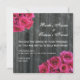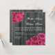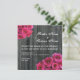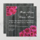 Um convite de casamento com uma foto de fundo de madeira de celeiro. Fotos de bouquets de rosa-quente nos cantos superior esquerdo e inferior direito. Personalize o texto correspondente com detalhes do evento. O verso apresenta fundo de madeira de barnwood.