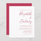 Este simples convite de casamento moderno apresenta um texto magenta cor-de-rosa sobre um fundo branco. Adicione os nomes da noiva e do noivo na caligrafia de escrita manual do na moda e os detalhes na fonte sans serif. O reverso é uma sombra de magenta sólida correspondente. NOTA: os envelopes não são incluídos automaticamente nestes convites de orçamento, portanto lembre-se de escolher a opção "envelopes brancos"!