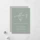 Mínimo Convite para Casamento de Sage Green Script. Estimula os seus convidados de casamento com este convite de casamento verde-musgo da moda que apresenta um belo roteiro branco num espantoso fundo verde de sábio. Este Convite tem um design verde de musgo espantoso, com vibrações modernas e mínimas, perfeito para o seu casamento simples, moderado e minimalista. O layout mínimo e na moda chama a atenção para o roteiro branco, contrastando com o fundo verde-claro. Este convite vai dar o tom de um belo cenário de casamento rodeado por florais brancos, sábios ou verdes musculados, e decor de casamento de oliveiras ou eucaliptos. Uma adição perfeita a qualquer celebração de casamento verde-claro mudo ou bonito. O Coletivo de Domingo © por Rachel Hannah Gee