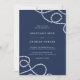 O Elegante design de convite de casamento costeiro mostra os detalhes do seu dia de casamento em letras brancas em um fundo azul marinho, acentuado nos cantos com laços de corda náutica trançada. Convites inversos a faixas náuticas largas.