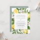 Este convite de casamento tradicional do limão moderno é perfeito para um casamento de primavera ou verão. O design mediterrânico rústico apresenta limões aquosos brilhantes e bonitos com flores brancas boêmicas e folhas verdes elegantes.