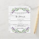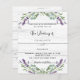 Madeira branca russa como fundo decorado com flores de lavanda e verde de eucalipto. Personalize e seus nomes e detalhes. 1 folha = 1 convite impresso de borda a borda.