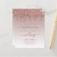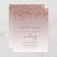 Um design moderno, chic, com um fundo em forma de ouro rosa com uma borda superior de pingos de ouro rosa. A palavra "casamento" e os nomes dos primeiros casais aparecem em letras minúsculas com traços decorativos no início e no fim, com o texto restante na letra sans serif. O fundo do ombre rosa dourado e a borda de gotejamento com brilho são repetidos no sentido inverso. (Para guardar as hastes, substitua apenas as letras, deixando os símbolos no lugar.)