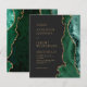 A borda direita deste elegante convite de casamento moderno apresenta uma esmeralda verde aquarela agate borda com falsa brilho dourado. O texto personalizável combina fontes serif, copperplate e itálico de cor dourada em um fundo preto de ardósia. O verso apresenta um design emerald verde e dourado.