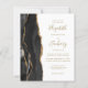 A borda esquerda deste elegante convite de casamento moderno apresenta uma coloração aquosa preta, borda agitada, aparada com falso brilho dourado. O texto personalizável combina manuscrito, copperplate e fontes itálicas em cinzas de carvão em um fundo branco. O verso apresenta um design de agate preto e dourado correspondente.