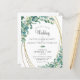 Convites de casamento botânico modernos e elegantes impressos em papel leve, ideais para orçamentos conservadores e/ou entrega manual a convidados com eucalipto verde, um falso quadro oval brilhante dourado e texto de cinza de carvão suave. Entre em contato com o designer por meio do Zazzle Chat ou makeitaboutyoustore@gmail.com se você quiser que este design seja modificado, em outro produto ou em itens de coordenação.