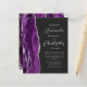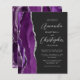 A borda esquerda deste elegante convite de casamento moderno apresenta uma cor d'água roxa, borda agitada com falso brilho prateado. O texto personalizável combina o script de cinza prateada e as fontes sans serif em um fundo preto de slate. O verso apresenta um design de agata prateado e roxo correspondente.
