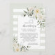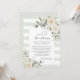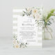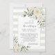 O convite de casamento mostra uma design romântica e elegante. Apresenta um arranjo floral exuberante com flores brancas e creme, como rosas e peões, intercalados com folhagem verde e bagas brancas. O fundo alterna faixas horizontais claras, verdes e brancas, adicionando textura sutil e na moda. O texto central é enquadrado numa caixa retangular branca, delimitada pelos sotaques florais, criando uma estética equilibrada e sofisticada. O aspecto geral é suave, encantador e perfeito para uma celebração refinada. Fácil de personalizar com suas informações.