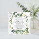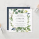Nosso convite de casamento Eucalyptus Grove em um formato quadrado único enquadra seus detalhes de casamento com a cor d'água, folhas verdes e pequenos marinhos azuis. Uma escolha moderna, porém orgânica, para o outono e casamentos no inverno com folhagem botânica verde e elegantes.