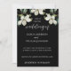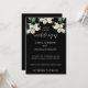 O convite para o casamento elegante com um fundo negro adornada com delicados florais brancos. o design combina a caligrafia moderna com fontes clássicas de serifa, criando o equilíbrio perfeito de romance e sofisticação. ideal para casamentos modernos e florais, com nomes personalizáveis e detalhes de eventos que se adequam ao dia especial de cada casal.