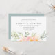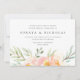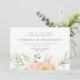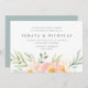 Nosso convite de casamento floral em um layout horizontal enquadra seus detalhes de casamento com uma borda de flores pintadas de aquarela e folhagem em tons suaves de pêssego e verde pastel. Coordena-se com nosso casamento e a coleção de eventos da Airy.