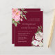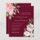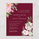 Um elegante convite de casamento floral com flores cor d'água cor-de-rosa com caligrafia moderna manuscrita em fundo vermelho-burgundy.