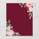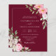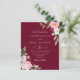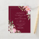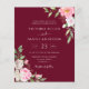 Um elegante convite de casamento de orçamento floral com flores cor-de-água rosa pinceladas com caligrafia moderna manuscrita em um fundo vermelho burgundy.