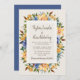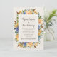 Convite de casamento elegante e romântico com belos florais azuis e laranja e verde num fundo de cor castanho/creme. Perfeito para o outono ou casamento no inverno.