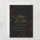 Um convite de casamento luxuoso, preto e ouro, adornado com rosas vermelhas profundas, perfeito para uma celebração noturna ou um casamento romântico de outono.