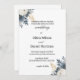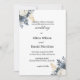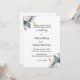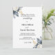 Design apresenta uma elegante camada floral de aquarela decorada com peônias, rosas, eucalipto verde e mais em tons de marinho azul, verde e marfim. Design também apresenta uma caixa de cinza prateada por baixo da coroa com um layout de texto moderno. Um arranjo floral correspondente é adicionado ao verso do carregar sobre o tema geral.