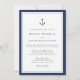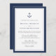 Nossos elegantes convites de casamento apresentam estilo náutico clássico com um olhar limpo e minimalista. Design apresenta uma borda dupla de azul rico marinho com a ilustração de âncora de uma nave no topo. Bloqueio elegante e anotações de script em cinzas suaves e marinho azul correspondente completam a aparência. Perfeito para iate clube, barco, praia ou casamentos de verão. Precisa de ajuda com o convite de casamento ou a personalização? Entre em contato comigo através do link "Perguntar a este Designer" nesta página.