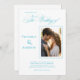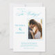 Anuncie seu dia especial com nosso espantoso Convite de Casamento Branco e Teal apresentando um roteiro elegante e uma foto personalizada do casal feliz. Este design clássico expele sofisticação e romance. Foto personalizada: Mostre seu amor com uma imagem carinhosa. Script Elegante: um toque e um script detalhados em um fundo branco nítido para um toque sofisticado. Impressão de alta qualidade: garantir que todos os detalhes sejam capturados lindamente. Totalmente personalizável: personalize o texto para refletir sua história de amor exclusiva.