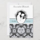 Nosso convite personalizado de casamento personalizado para o primeiro beijo, 5 horas por dia, 7 dias por semana, apresenta um novo marido e esposa prestes a se engajar no primeiro beijo. Uma cinza e um fundo branco com banda azul-mar e texto que diz "ele pediu...eu disse sim" e áreas onde você pode adicionar seus detalhes de cerimônia e recepção em um convite de casamento totalmente personalizável e único.