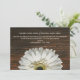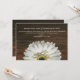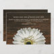 Um convite de casamento com uma imagem de uma margarida branca de gerbera no fundo sobre um fundo de madeira marrom escuro. Personalize o texto com detalhes da sua ocasião.