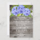 Encantador e atraente, este convite apresenta lindas drangas azuis em flor de cheio, adornada com ferro, verde e rendas brancas sobre o fundo da madeira rústica da cinza. Perfeito para casamento de primavera, jardim ou ao ar livre.
