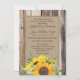 Design de convite de casamento ocidental da Rússia com buquê de girassol sobre tecido de aparência de linho e madeira de celeiro e um coração gravando com monograma no fundo.