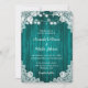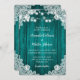 Convites de casamento Rústicos Teais inspirados por um rendas floral branco e luzes de cordas em um fundo de madeira. design de cartas perfeito para convidar seus convidados para sua festa de casamento rústica romântica.