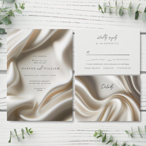 Um convite de casamento luxuoso, inspirado em cetim, que apresenta tecido suave para um olhar eterno e elegante. O verso inclui a frase "O Forever começa aqui", que pode ser personalizada ou removida para se adequar ao seu estilo. Perfeito para casais que amam a simplicidade moderna com um toque de luxo.