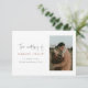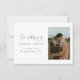 Convite Simples E Elegante De Casamento De Fotos. Este design refinado apresenta uma foto de solteiro à esquerda, belamente balanceada com a tipografia moderna e mínima à direita. O layout limpo inclui espaço para uma mensagem pessoal, sua data de casamento e local, enquanto os nomes do casal são assinados elegantemente em um estilo manuscrito, adicionando um toque pessoal e romântico. A parte traseira tem espaço para outra foto de cobrir de cheio.