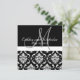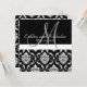 Cartão RSVP e Convite para Casamentos tema damasco Pretos e Brancos, combinado com o titular do lugar para escrever o nome do convidado no convite.Design de Elke Clarke. Cinza monograma inicial com sobreposição de texto de fonte de script branco em um plano de fundo preto. O espaço reservado para o nome de convidado está na parte de trás do qual você pode escrever manualmente com uma caneta metálica de prata ou ouro (o que mostra o fundo preto). Ou aproveite o fato de que você pode solicitar seus convites um de cada vez, para que você possa usar o menu de edição do Zazzle para adicionar o nome de seu convidado e imprimi-lo diretamente no convite. Então para 10 convidados você teria 10 ordens de "1" no seu carrinho, cada uma com um nome de convidado diferente no design. Personalize com suas informações e cores de casamento.