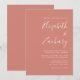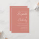 Este simples convite de casamento moderno apresenta um texto branco sobre um fundo de terracota. Adicione os nomes da noiva e do noivo na caligrafia de escrita manual do na moda e os detalhes na fonte sans serif. O reverso é uma sombra de terracota sólida.